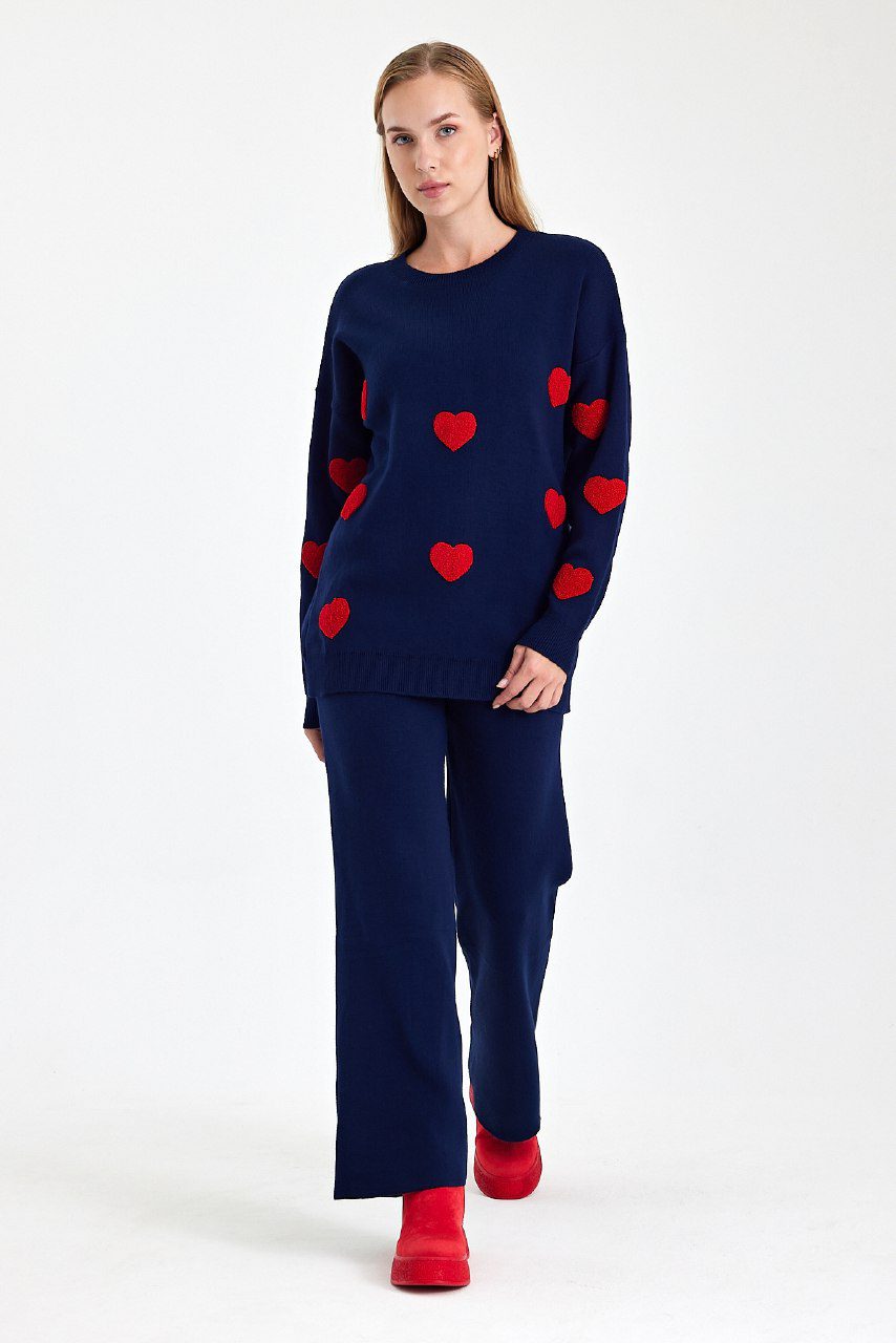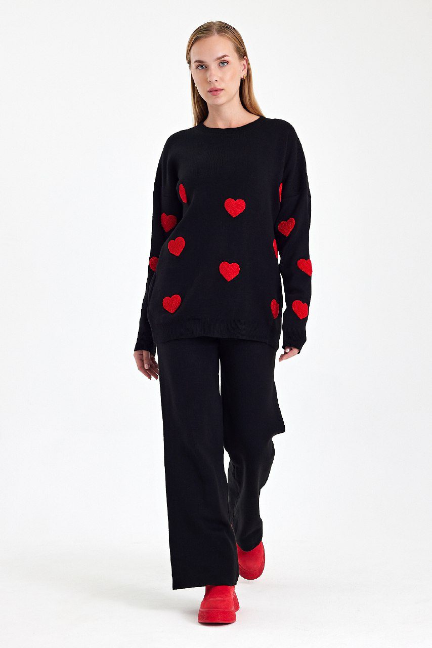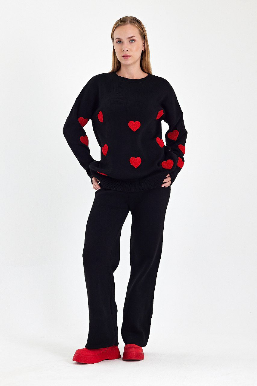 Πλεκτό σετ με παντελονι και μπλούζα με καρδούλες σε άνετη γραμμή για cute και casual εμφανίσεις.