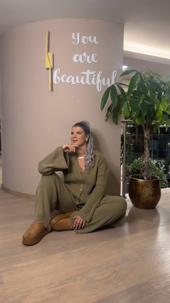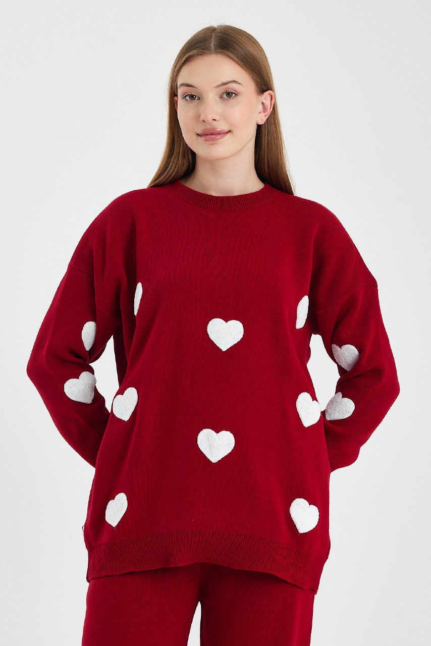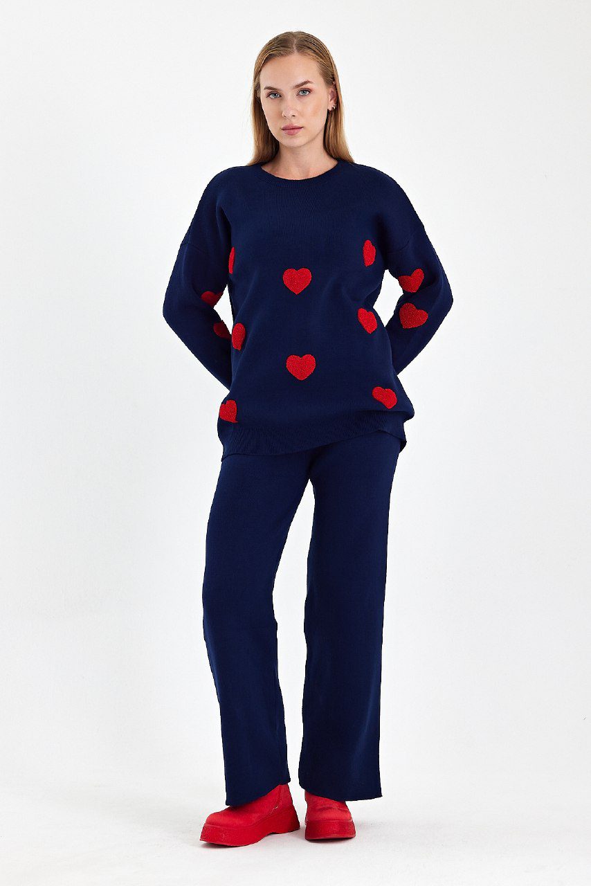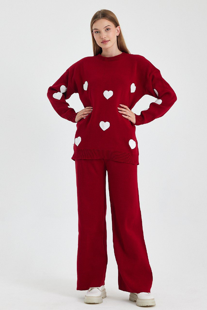 Πλεκτό σετ με παντελονι και μπλούζα με καρδούλες σε άνετη γραμμή για cute και casual εμφανίσεις.