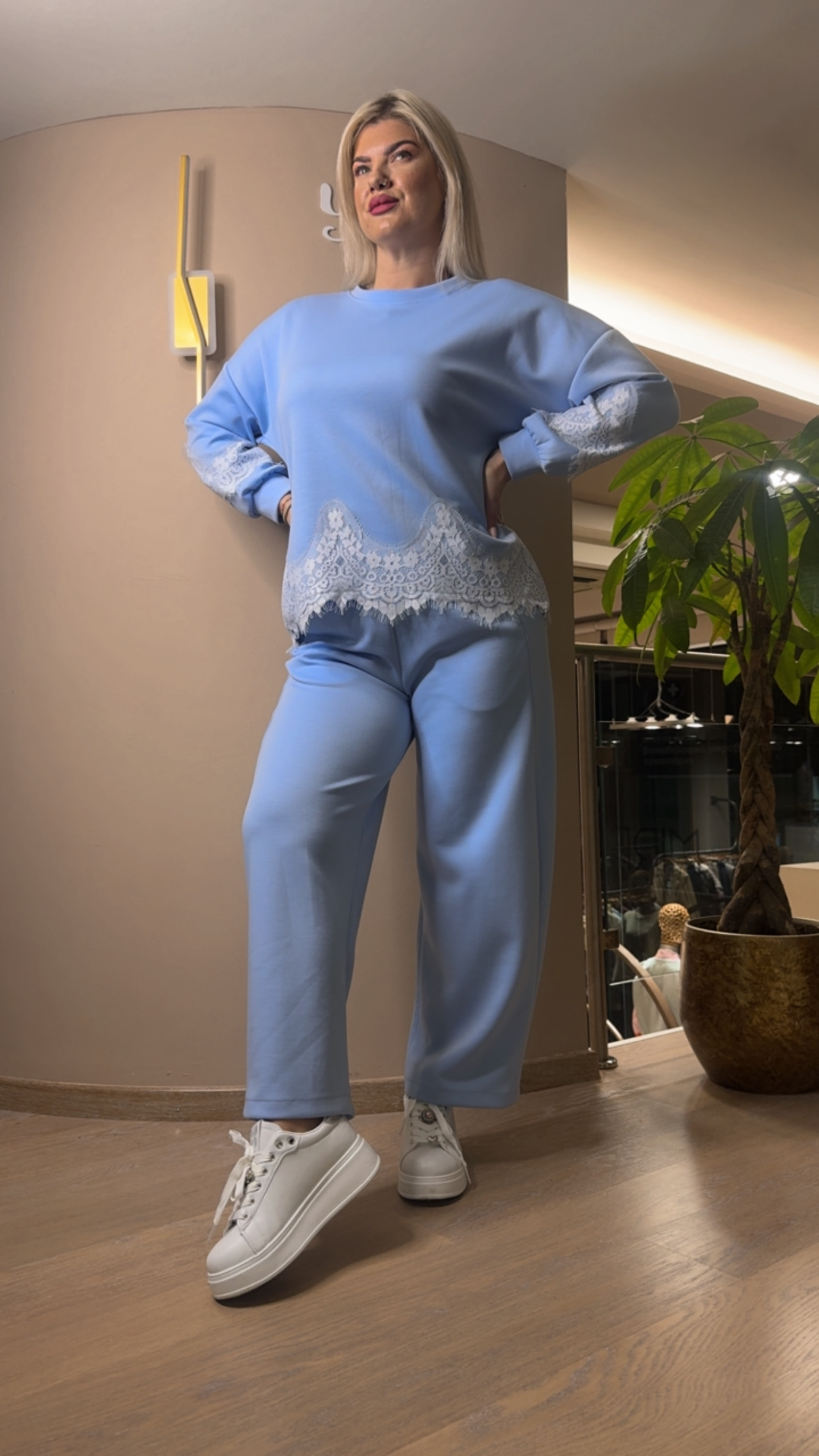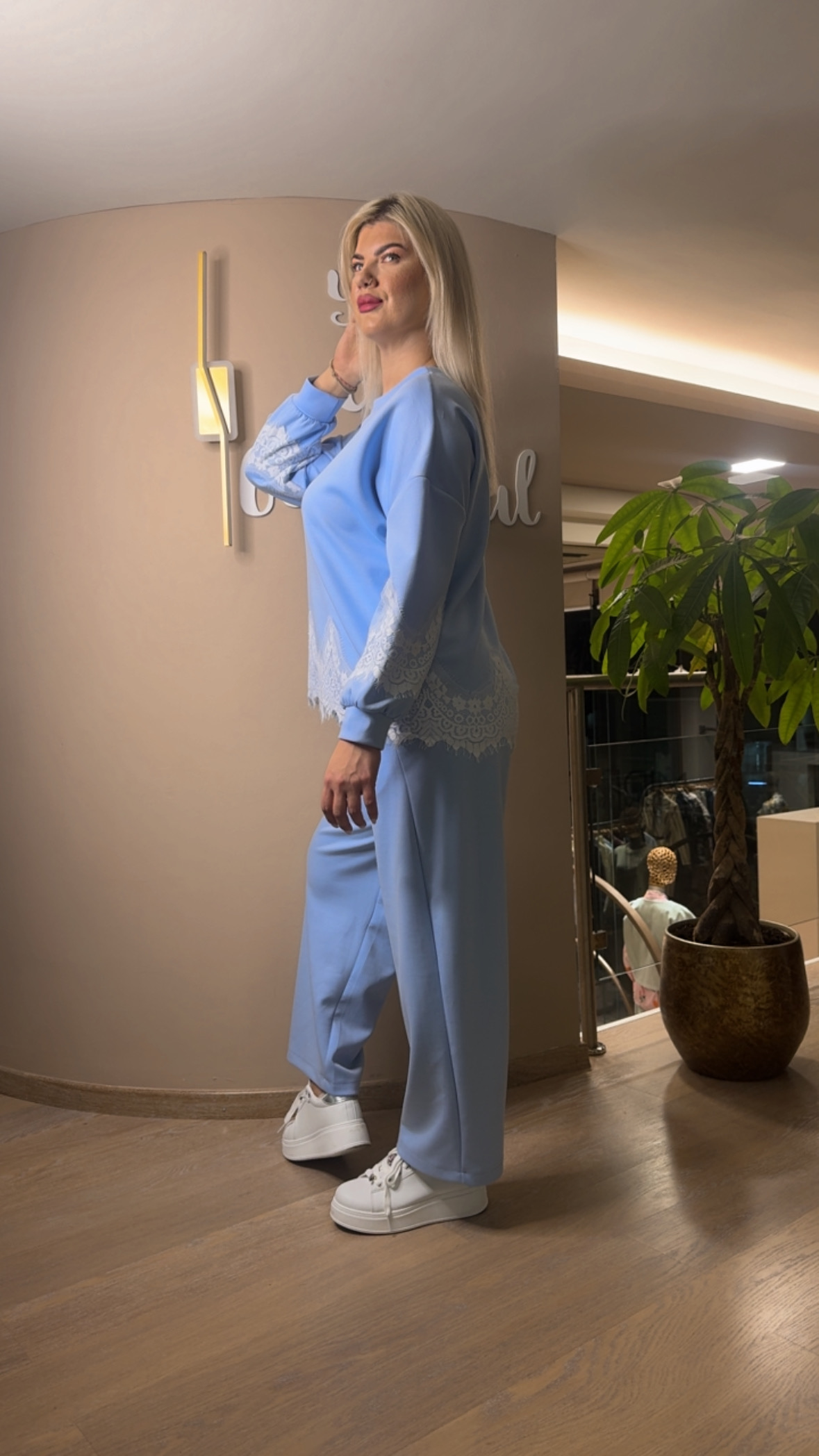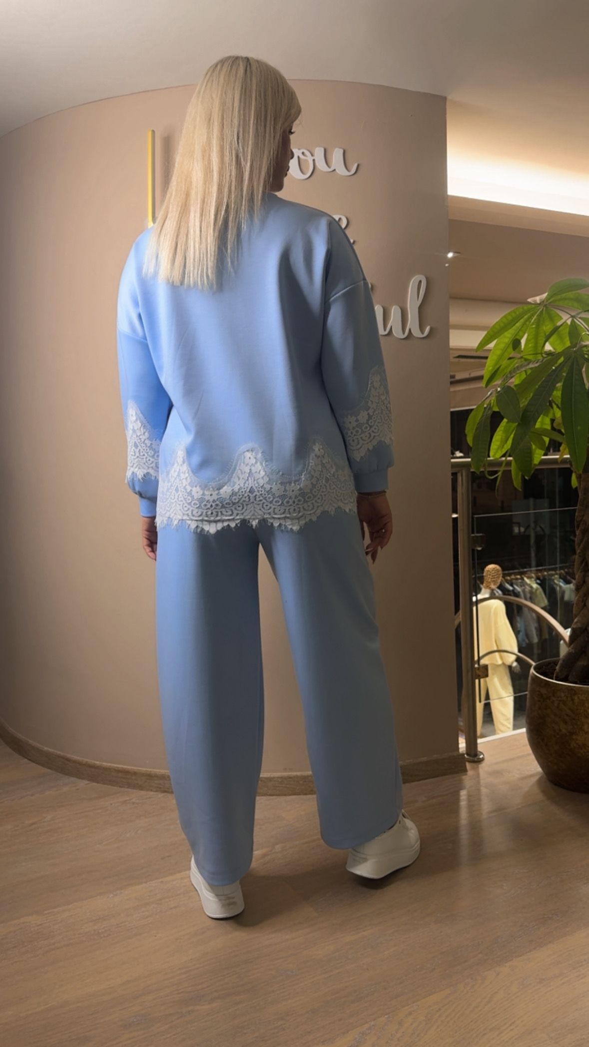Σετ Μπλούζα Παντελόνι Γαλάζιο Με Δαντέλα Λευκή Στο Τελείωμα